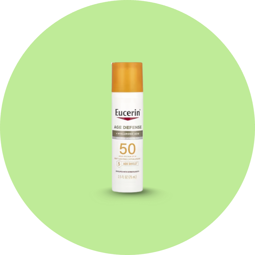 Eucerin’s Age Defense Lightweight Sunscreen SPF 50 is designed specifically for the delicate skin on your face. Powered by 5 AOX Shield™, an advanced antioxidant complex, and enriched with Hyaluronic Acid, this dermatologist-developed formula helps reduce signs of aging while offering superior UVA/UVB protection.